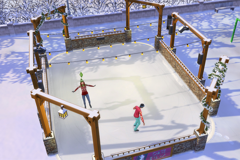 Um belo ringue de patinação no gelo não poderia faltar. É possível encontra-los no modo de construção ou espalhados pela cidade. Meu Sim levou um leve tombo, mas tá tudo bem! Eventualmente ela até aprende a dar umas piruetas.